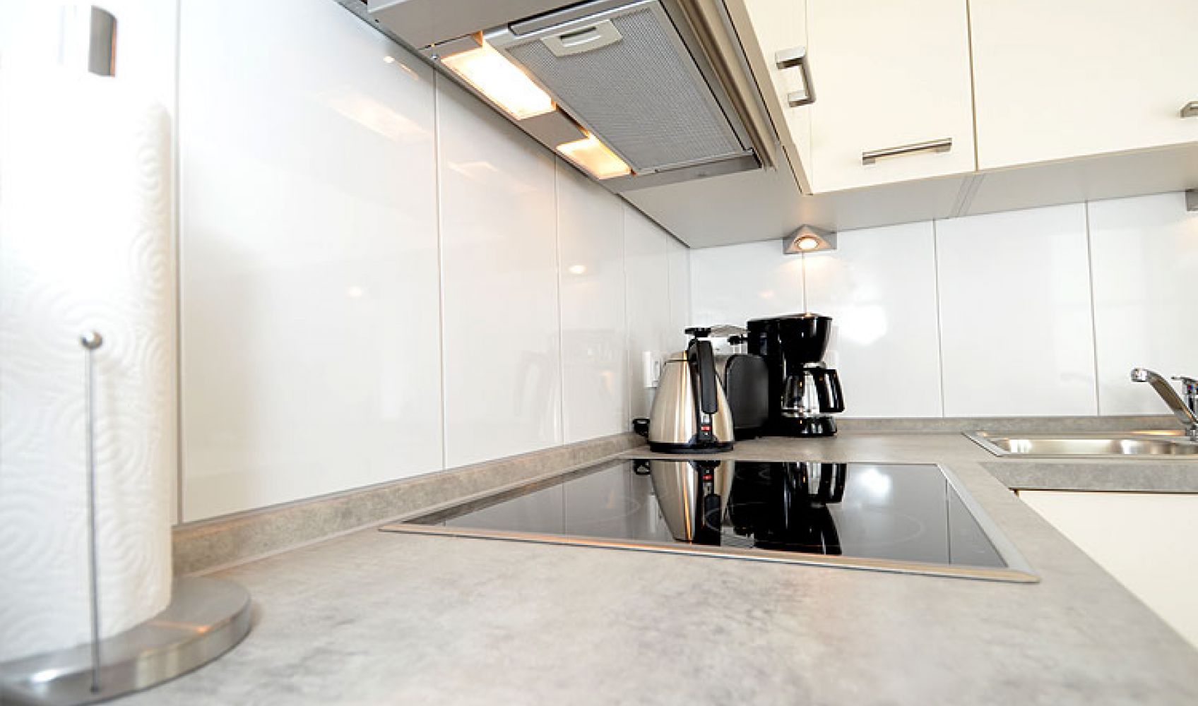 Angrenzend durch eine Schiebetür getrennt gelangen Sie in die Küche. In dieser finden Sie einen Kühlschrank mit Gefrierfach, einen Backofen, eine SENSEO-Kaffeemaschine, ein 4-Platten-Cerankochfeld, eine Spülmaschine, eine Mikrowelle und diverses Kleininventar, das die Küchenausstattung komplettiert.