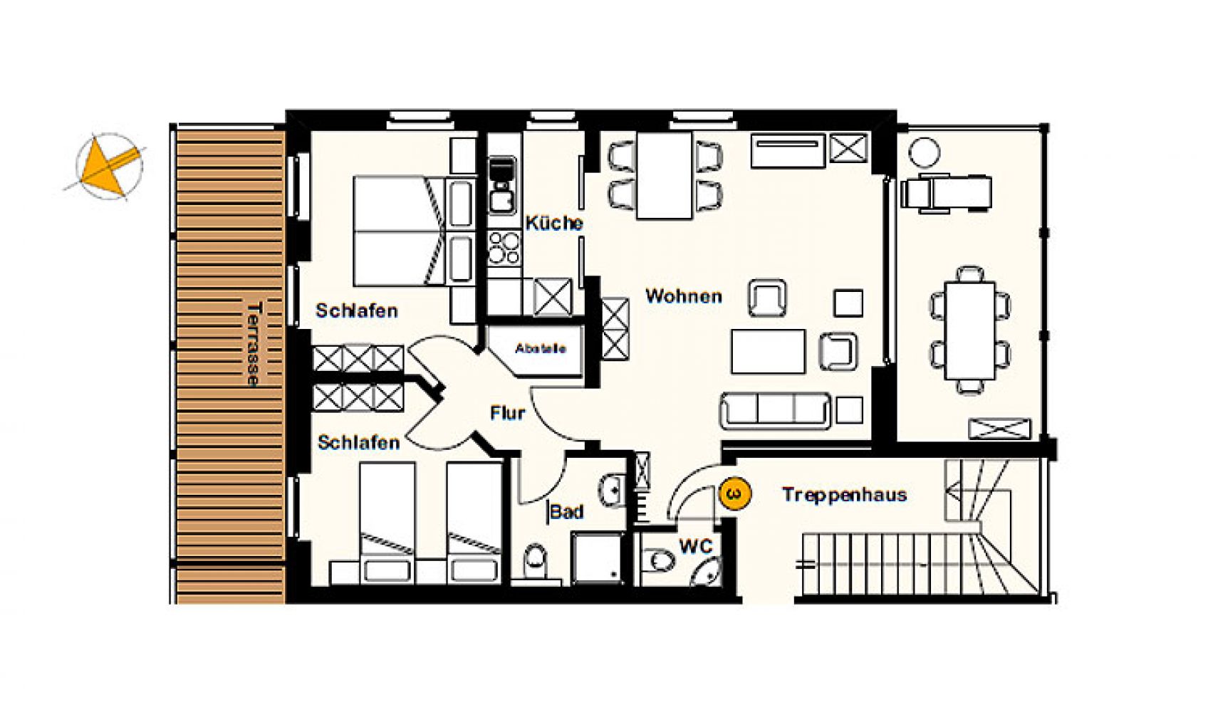 Das Highlight dieser Wohnung ist jedoch der sonnige Wintergarten zur Südseite mit Sitzecke und Entspannungsliege. Dieser lässt sich bei starker Sonneneinstrahlung mit Lamellen verdunkeln.
